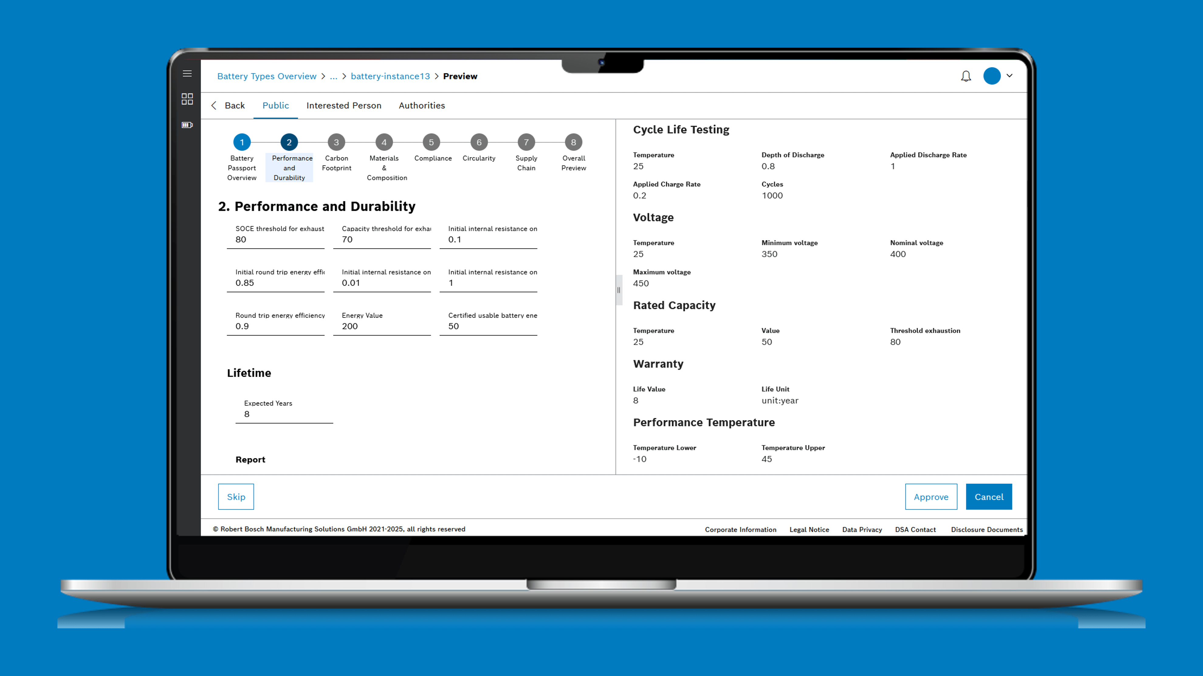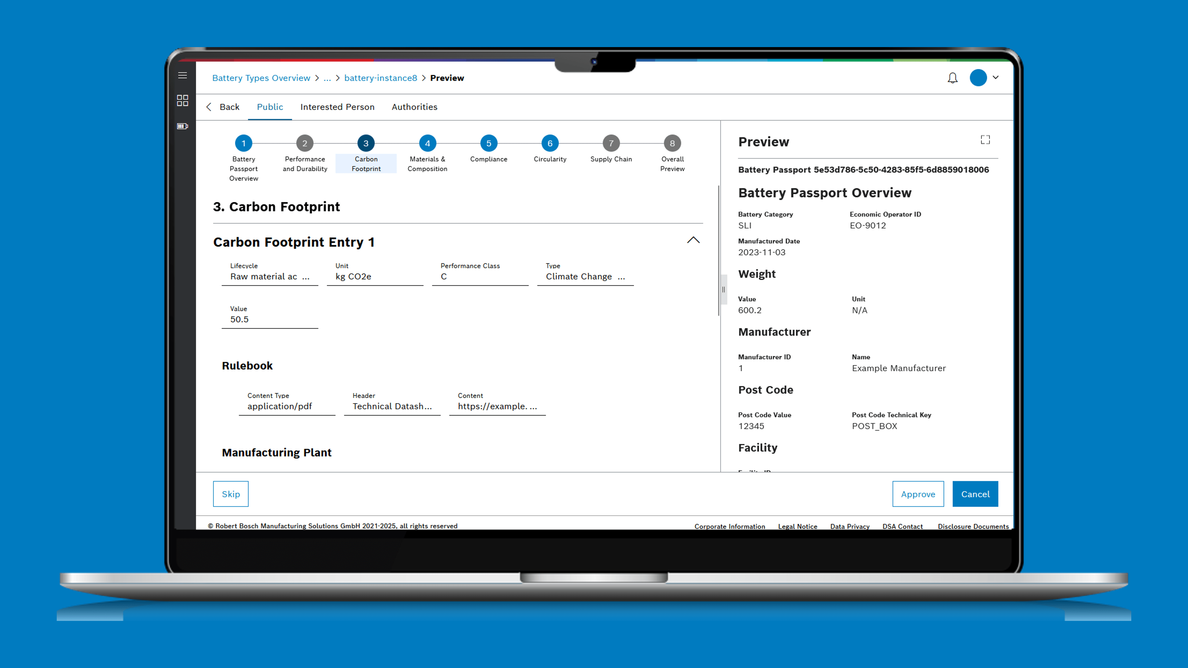With the Bosch Battery Passport, you comply with EU battery regulations through complete transparency across your batteries' lifecycle – the digital twin solution supports regulatory compliance while forming the foundation for numerous additional value-creating applications.